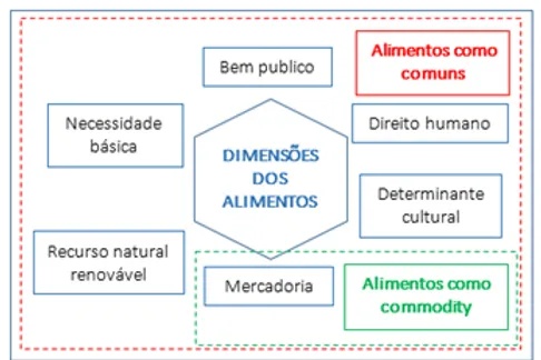 O autor Viveiro Pol desenvolve, ao longo de seus trabalhos, um framework para apresentar as dimensões que compõem os alimentos como “comuns” e as dimensões que compõem os alimentos como commodity. No centro desta proposta está o fato de que as dimensões apresentadas por ele e que compõem os alimentos como comuns – determinante cultural, direito humano, bem público, necessidade básica e recurso natural renovável – não podem ter suas aptidões avaliadas apenas como valores mercantis. No entanto, os alimentos são compreendidos como commodity quando a dimensão – mercadoria – que se baseia nas trocas econômicas prevalece sobre as dimensões não-econômicas. Na prática, no entanto, governar os alimentos como comuns implica que as dimensões consideradas não mercantis sejam tão importantes quanto a dimensão dos alimentos como commodity (VIVERO POL, 2018a; 2018b; 2017). A figura abaixo mostra a organização destas dimensões acima apresentadas.